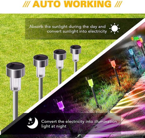 Our Solar Pathway Lights are powered by sunlight during the day. Our Solar Outdoor Pathway Lighting automatically charges during the day, over a period of 6-8 hours, automatically lights up 6-10 hours at night, and off at dawn, long-lasting, environment-friendly, energy and money-saving.