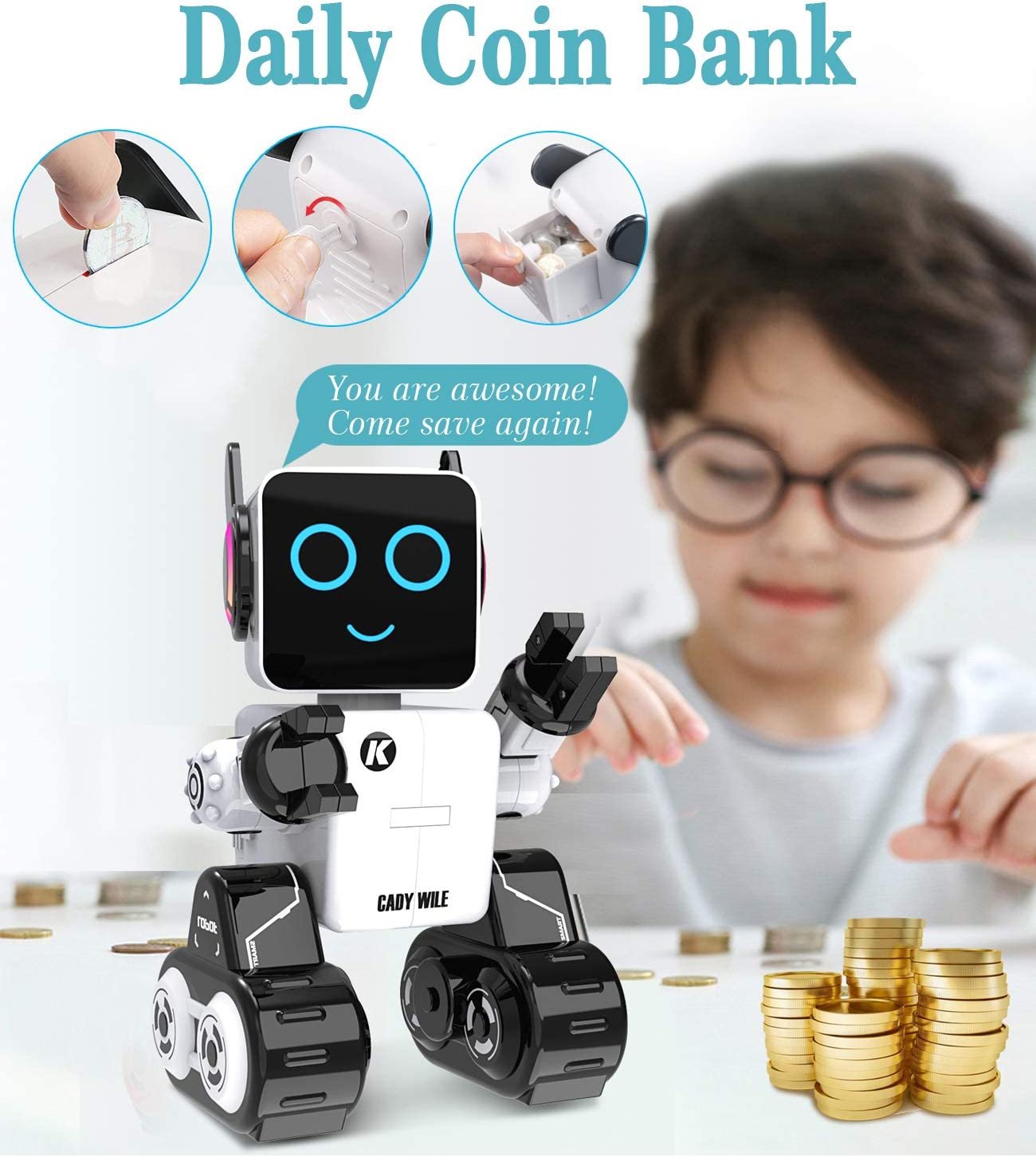 • 【BUILT-IN PIGGY BANK】This Intelligent Interactive robot has a coin bank on top of its head allowing the children to deposit coins, which offers a positive way for them to start learning the importance of saving and developing good habits in financial management. The robots feature colorful LED lights placed in their ears that change different colors and get your child’s attention easily.