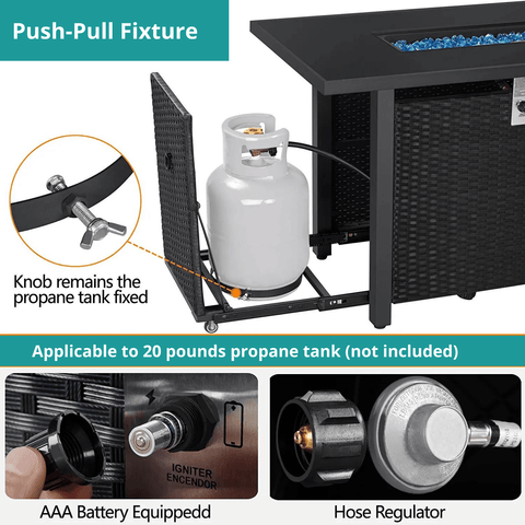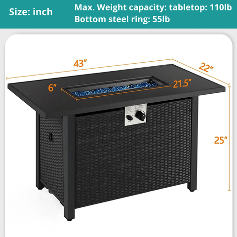 PERFECT OUTDOOR ADDITION: This rectangular fire pit table is a perfect combination of versatile functions and modern style featuring a tempered glass tabletop and wicker side panels with 50,000 BTU rated heat output, perfect for your garden, backyard, terrace, courtyard, and balcony.