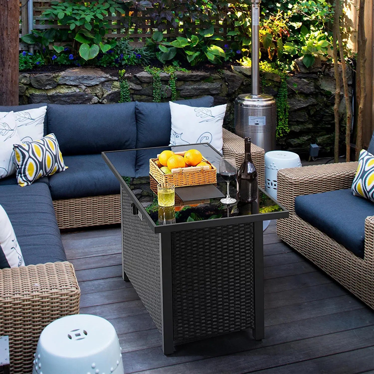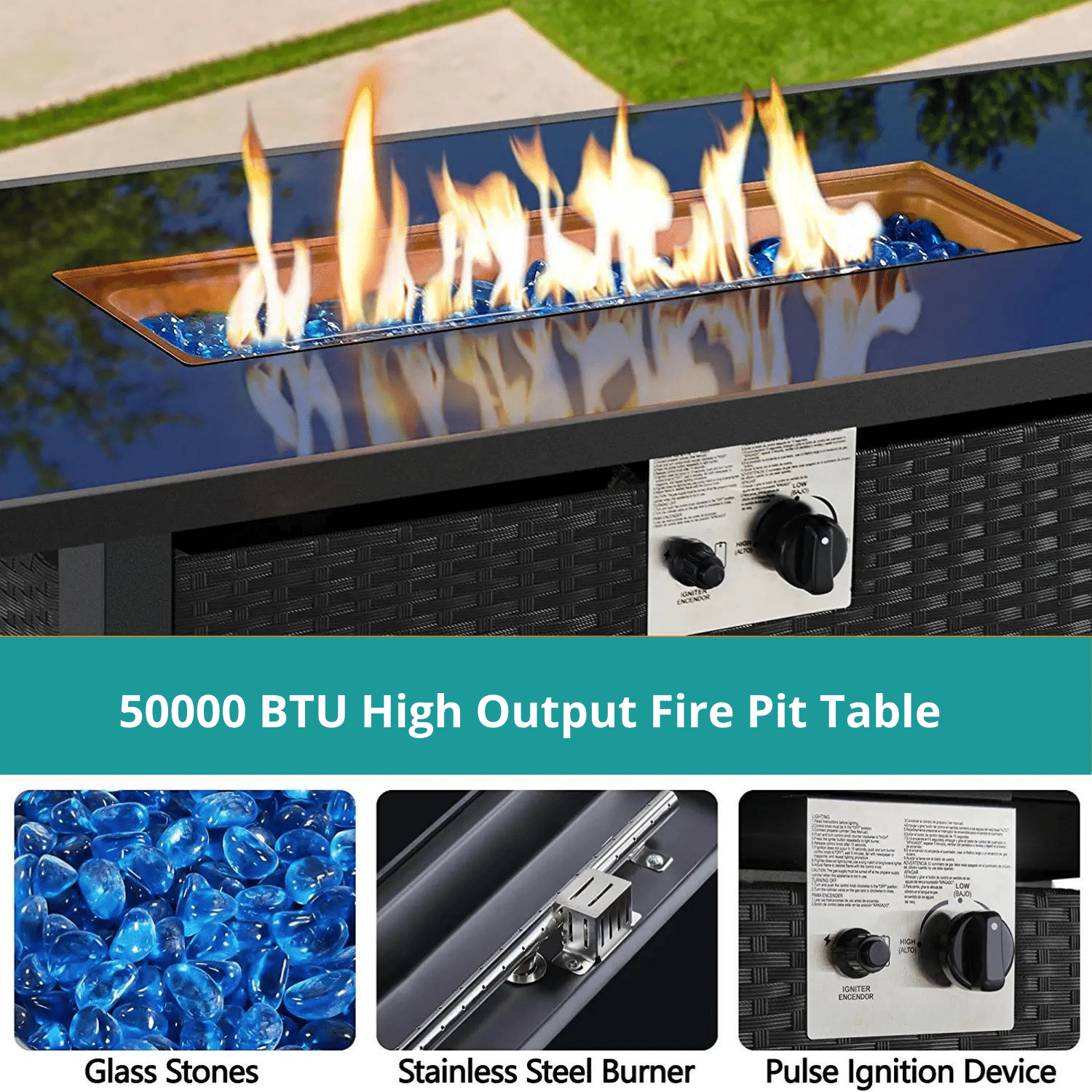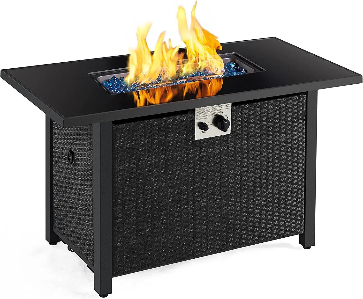 PERFECT OUTDOOR ADDITION: This rectangular fire pit table is a perfect combination of versatile functions and modern style featuring a tempered glass tabletop and wicker side panels with 50,000 BTU rated heat output, perfect for your garden, backyard, terrace, courtyard, and balcony.