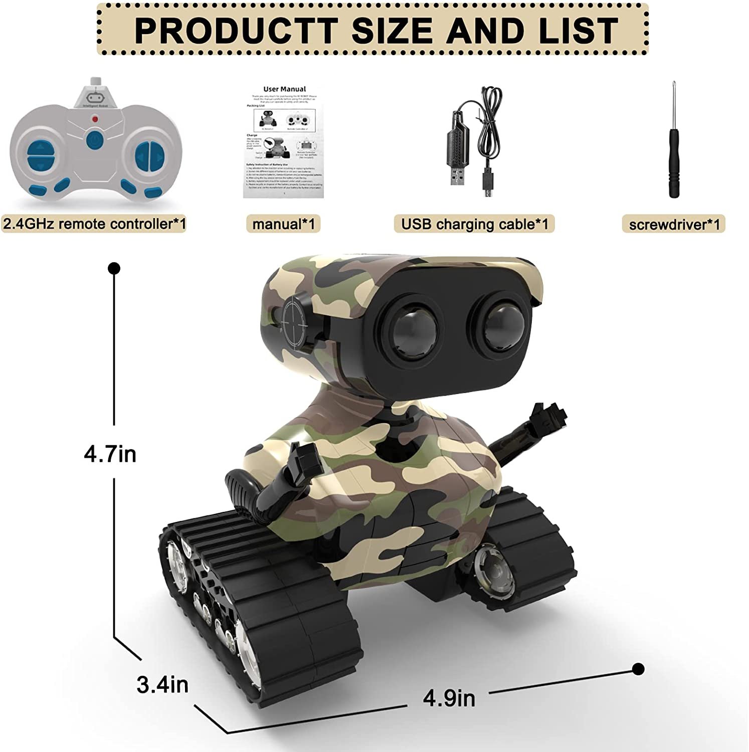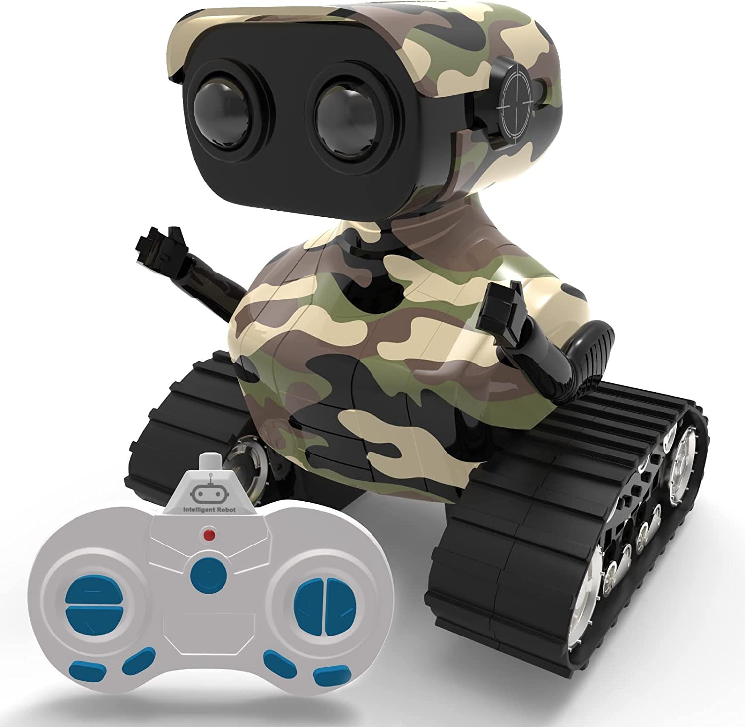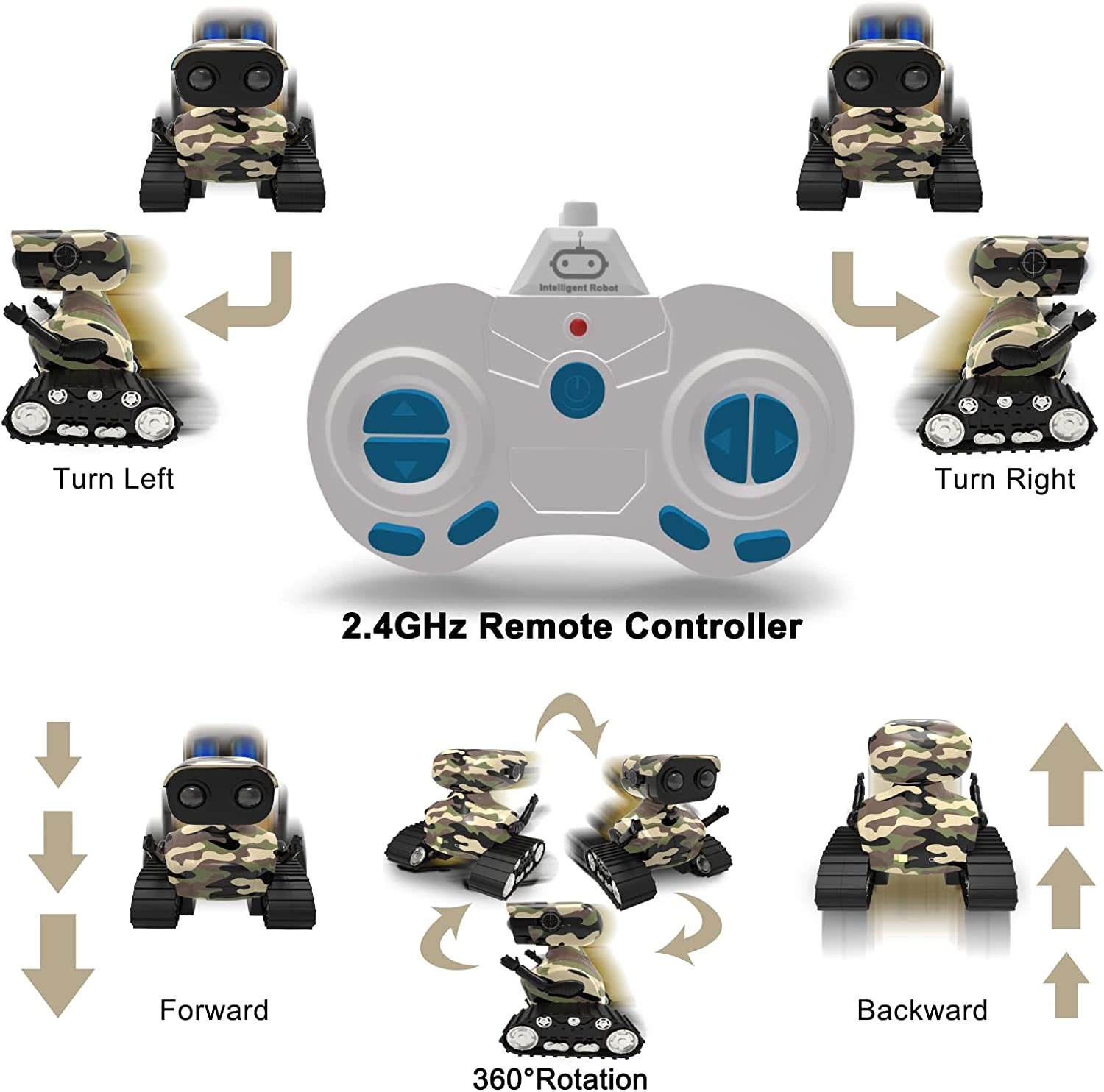- The remote control robot is designed in 2 parts. The upper part is a cute robot with LED eyes and flexible arms, Gestures can be adjusted. The bottom part is tank tracks, which can slide left and right and rotate 360° in place.