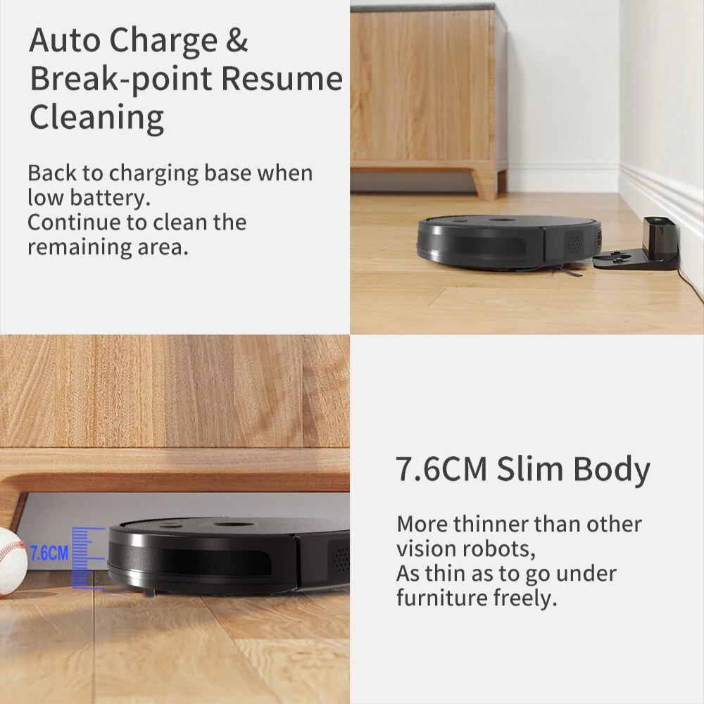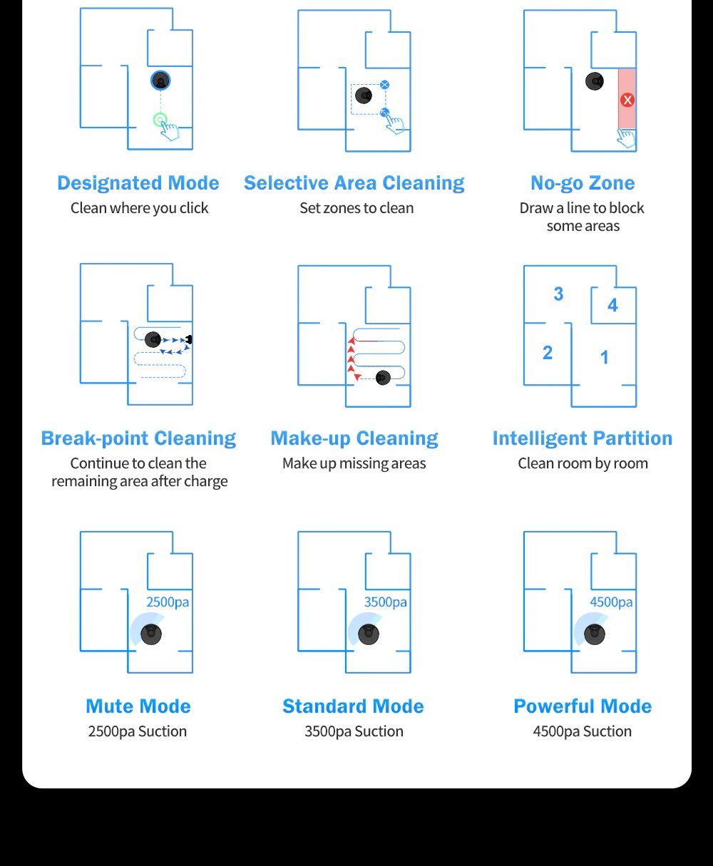 Our Robot APP will update the map in real-time that the robot vacuums will clean your home according to the room or the order of your instructions like a human. The App will convenient for you to intelligently manage your cleaning plan by adding virtual walls and No-go zones, setting cleaning time schedules, zone cleaning, and “find” your robot.