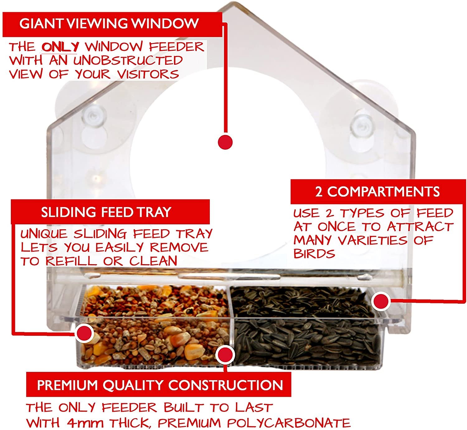 The Original Window Bird Feeders for Outdoors Hanging – Our Window Sill Bird Feeder is Constantly improved and developed since 2014. EASY TO FILL, AND CLEAN. No need to remove the whole feeder. Simply slide the patented tray out, fill it, and slide back in. This is chore kids will fight over, and elderly hands will have no problem. Four HEAVY DUTY SUCTION CUPS ensure your Bird Feeder That Attaches to the Window is out of squirrels’ reach and will never fall. Ever.