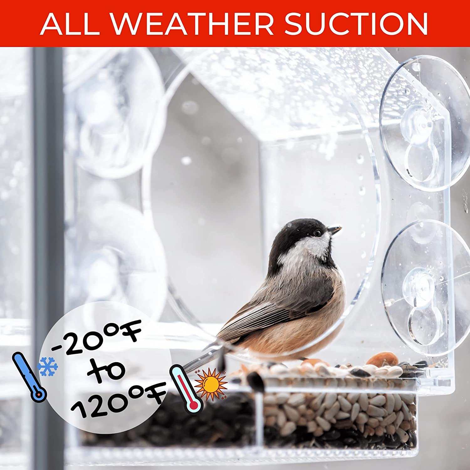 NO SQUIRRELS! Ever seen a squirrel climbing a glass window? They can’t! Keep the Bird Feeders for Apartment Windows installed 10 feet away from ledges, gables, and branches and Mr. Nuts doesn’t stand a chance. This is one squirrel-safe bird feeder! The patented air circulation system will also keep the seed dry and safe.